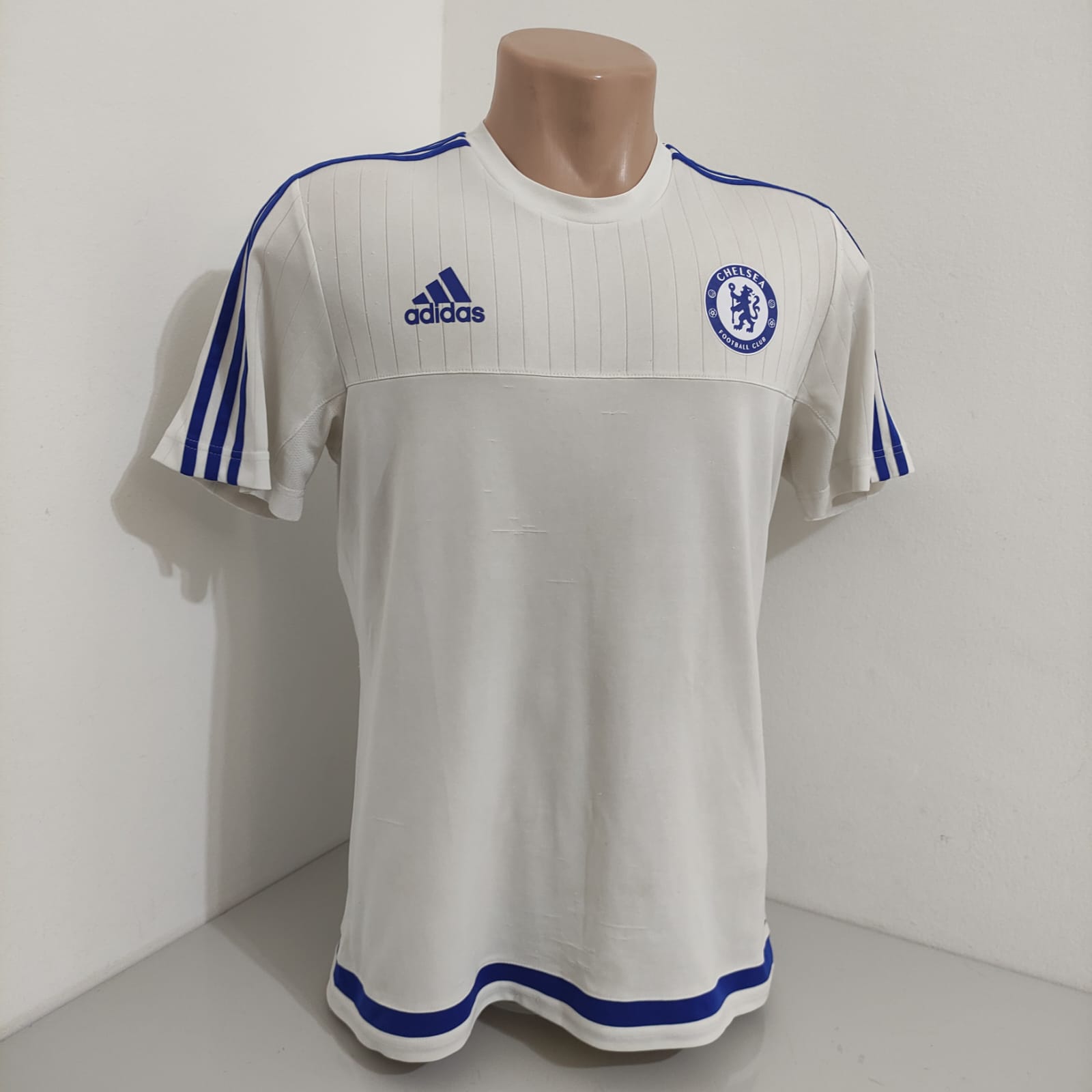 Camisa de treino do Chelsea 2015/16. Camisa tem bolinhas e fios puxados no tecido, detalhes registrados nas fotos.