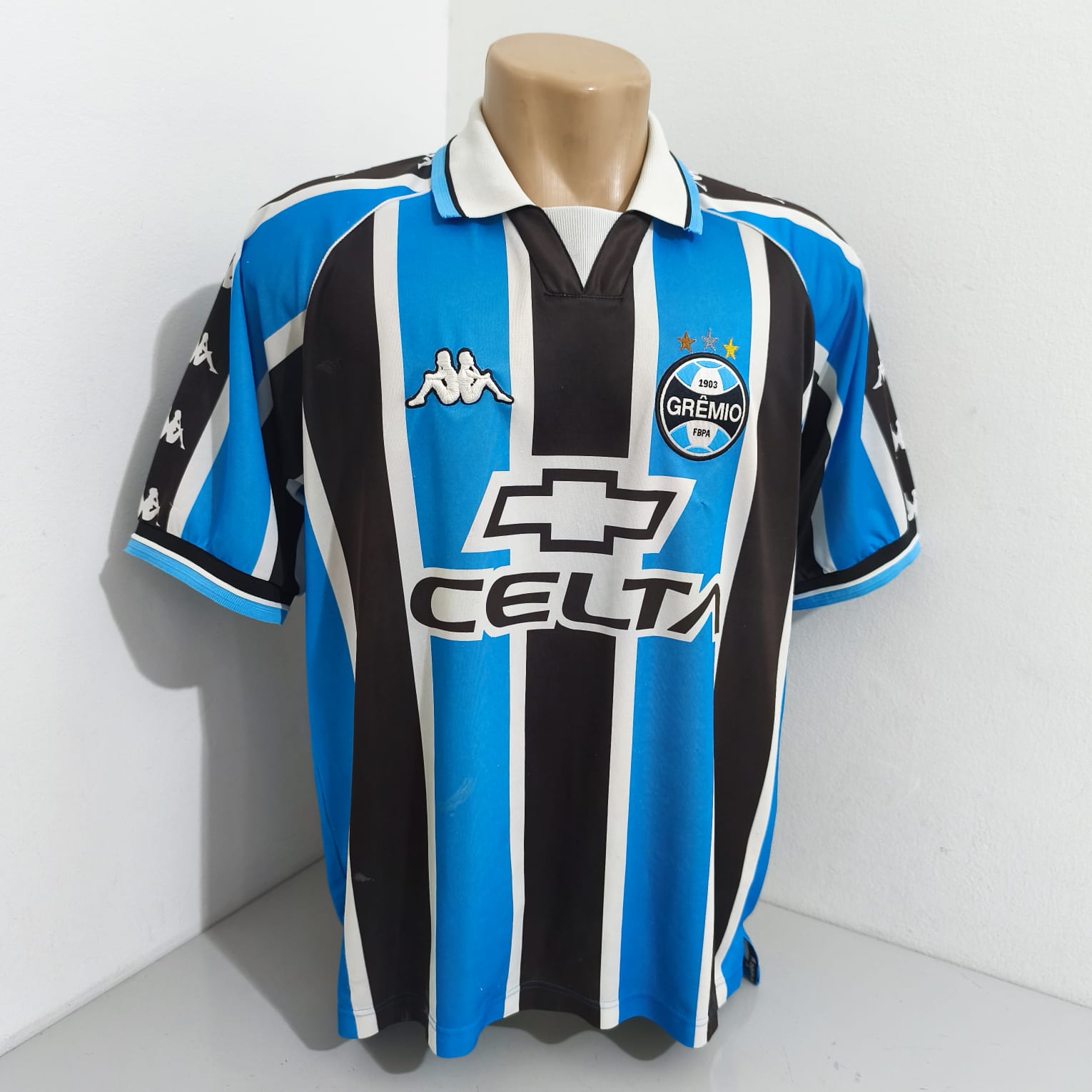 Uniforme titular do Grêmio 2000, camisa de jogo, número pintado.
