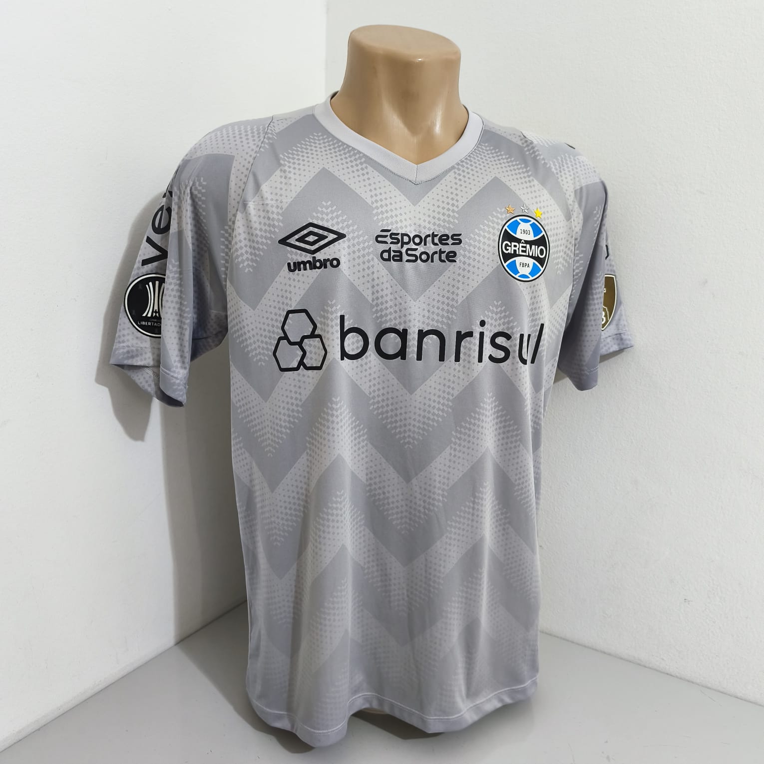Uniforme de goleiro do Grêmio 2024 cinza. Camisa game, com todos patrocínios e patch da Libertadores. Goleiro Caíque.